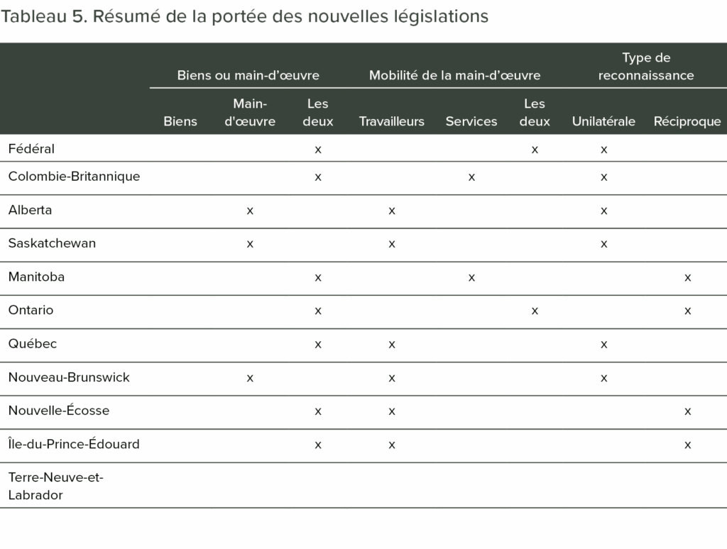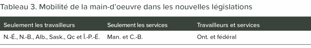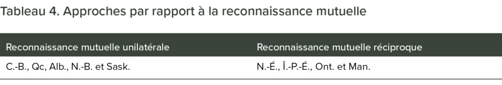 En ce qui a trait à la mobilité de la main-d’œuvre, la Colombie-Britannique, le Québec, l’Alberta, le Nouveau-Brunswick et la Saskatchewan ont choisi l’approche unilatérale. En revanche, la Nouvelle-Écosse, l’Île-du-Prince-Édouard, l’Ontario et le Manitoba ont préféré le modèle de réciprocité. Par contre, on ne sait pas vraiment lesquelles de ces provinces ont considéré les autres comme ayant fait preuve de réciprocité.
