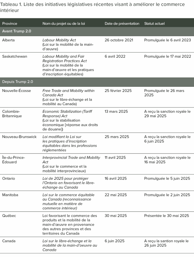 Le 25 février 2025, le premier ministre de la Nouvelle-Écosse, Tim Houston, a présenté le projet de loi 36, le Free Trade and Mobility within Canada Act (loi sur le libre-échange et la mobilité au Canada). Cette loi est la première adoptée dans la foulée de l’offensive tarifaire de Trump 2.0. Parmi les lois subséquentes, celle de l’Île-du-Prince-Édouard, en particulier, s’aligne étroitement sur la loi de la Nouvelle-Écosse. La loi et l’initiative de la Nouvelle-Écosse ont été largement saluées comme transformatrices et ont valu de nombreux éloges au premier ministre Tim Houston et à la province en général (Campbell, 2025).