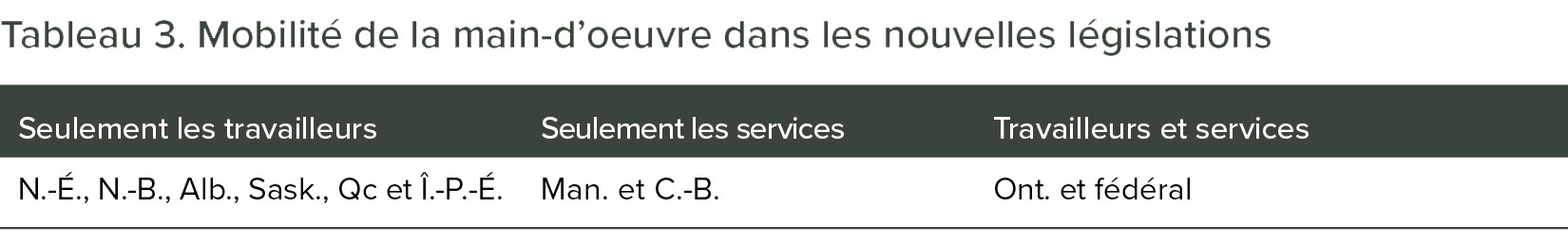 Le recours à la reconnaissance mutuelle pour favoriser la mobilité de la main-d’œuvre varie aussi d’une loi à l’autre. On peut globalement diviser les approches en trois camps. Le premier groupe est formé de la Nouvelle-Écosse, du Nouveau-Brunswick, de l’Alberta, de la Saskatchewan, du Québec et de l’Île-du-Prince-Édouard, où la mobilité de la main-d’œuvre est uniquement gérée à l’échelle des travailleurs. Ces provinces se concentrent sur la manière dont un organisme de réglementation accorde une licence ou une certification à une personne en particulier. Le second camp regroupe l’Ontario et le fédéral, qui abordent la mobilité de la main-d’œuvre à l’échelle des travailleurs individuels et à celle des services. En Ontario, par exemple, la loi s’applique à la fois aux personnes et aux entreprises. Le troisième groupe est constitué du Manitoba et de la Colombie-Britannique, qui se concentrent sur la fourniture de services plutôt que la certification d’une personne en particulier.