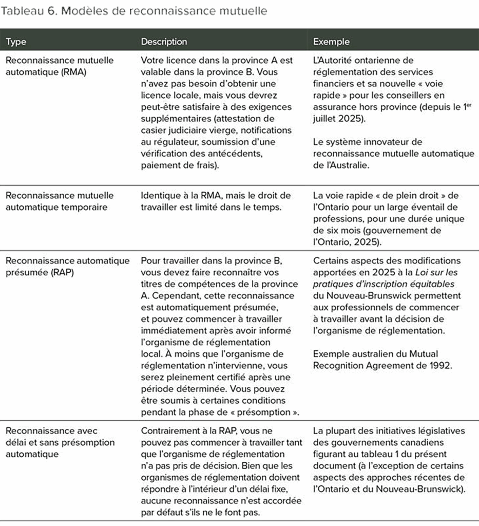 On compte quatre modèles généraux de reconnaissance mutuelle. Ils sont énumérés ci-dessous, du plus ambitieux au moins ambitieux. Dans l’ensemble, les efforts des gouvernements fédéral, provinciaux et territoriaux se sont concentrés sur le modèle le moins porteur, celui de la « reconnaissance avec délai et sans présomption automatique », à l’intérieur duquel les organismes de réglementation doivent rendre une décision à l’intérieur d’un délai explicite, mais 1) sans présomption automatique dès la notification de l’organisme de réglementation, 2) ni acceptation par défaut en cas de dépassement du délai. Tels étaient pourtant les piliers du modèle australien lors de la réforme de son marché intérieur en 1992.