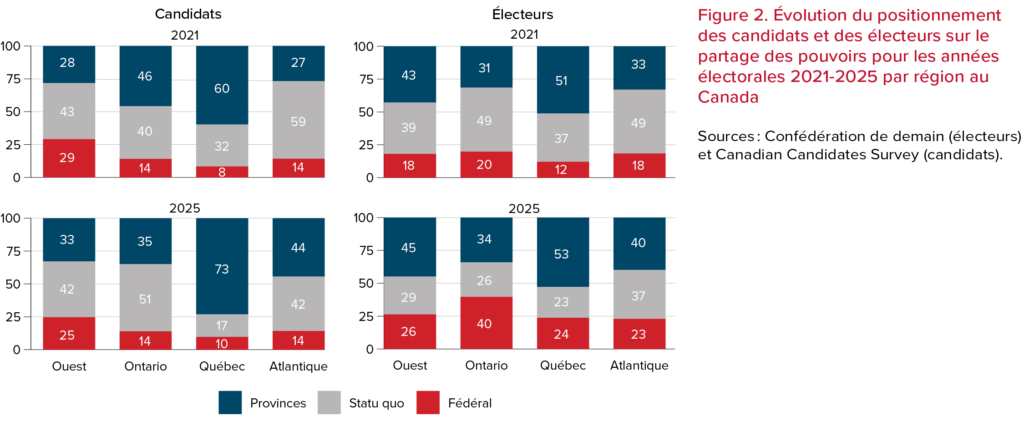La figure 1 montre que, lors des deux dernières années électorales au Canada (2021 et 2025), la position des candidats est restée relativement stable. En effet, 44 % pensent que les provinces devraient obtenir plus de pouvoir que le fédéral, contre 16 % seulement qui pensent le contraire. Or, malgré le changement de gouvernance aux États-Unis, accompagné d’une politique tarifaire agressive et de menaces récurrentes d’annexion territoriale, les élections de 2025 n’ont pas modifié de manière importante les positions des candidats aux élections en matière de partage des pouvoirs au sein de la fédération.