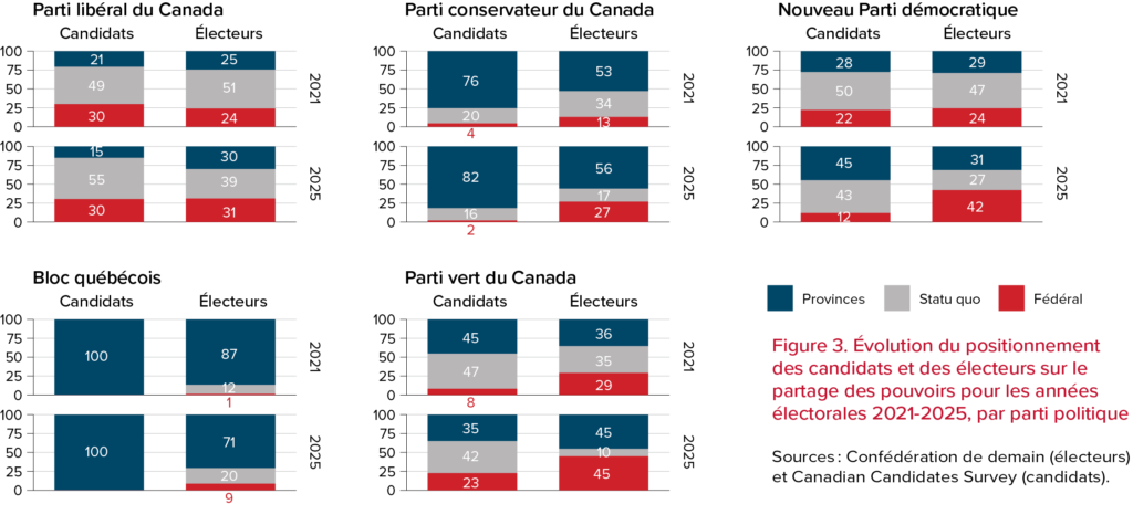 La posture des électeurs, cependant, a changé entre les deux périodes. En effet, alors que l’opinion publique était très similaire à celle des candidats aux élections fédérales de 2021 – avec 16 % des candidats et 17 % des électeurs favorables à un renforcement des pouvoirs du fédéral –, en 2025, c’est près du double des électeurs (31 %) qui souhaitent une plus grande centralisation. À l’inverse, si 43 % des électeurs désirent maintenir le partage des pouvoirs en 2021, ils ne sont plus que 27 % à penser ainsi en 2025. L’option du statu quo n’est donc plus la tendance dominante en 2025.