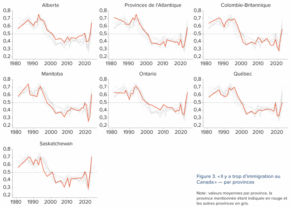 Cette phase de retournement de l’opinion peut sembler surprenante, compte tenu de la réputation du Canada comme pays tolérant, multiculturel et favorable à l’immigration. Si cette réputation est généralement fondée au niveau des politiques publiques, elle n’était pas toujours un reflet de l’opinion publique. Les sondages montrent qu’entre la fin des années 1970 et le milieu des années 1990, la majorité des Canadiens souhaitaient réduire l’immigration. L’opinion sur le sujet s’est ensuite améliorée au milieu des années 1990, a continué à progresser jusqu’au milieu des années 2000, puis s’est stabilisée pendant plus d’une décennie (Besco, 2021). Mais voilà qu’en 2023 et 2024, l’opposition à l’immigration augmentait rapidement (Environics Institute for Survey Resarch, 2024), les sondages montrant le revirement le plus marqué de l’opinion publique depuis au moins la fin des années 1970.