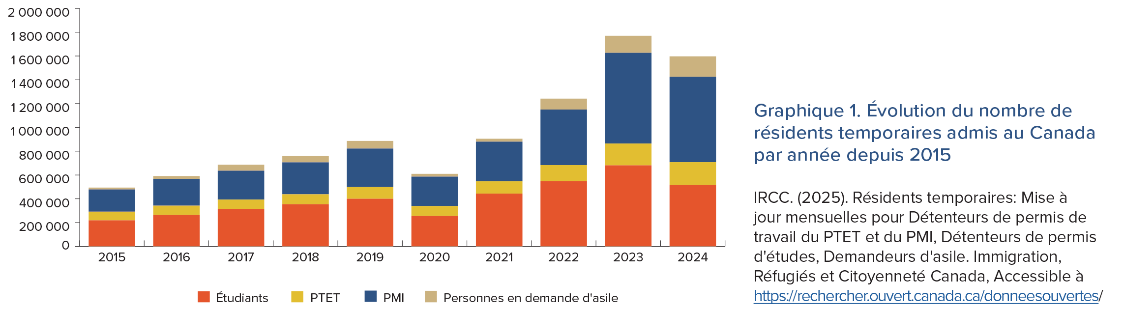 Le statut de résidence temporaire octroie des droits comparativement limités, notamment en ce qui a trait à l’emploi et l’accès aux services. Or, la population détenant ce statut au Canada a augmenté de manière importante depuis une quinzaine d’années. En 2025, elle est estimée à environ 3 millions de personnes alors qu’elle était de moins d’un million en 2010 (Statistique Canada, 2025; Citoyenneté et Immigration Canada, 2010). La résidence temporaire est désormais la principale voie d’admission des personnes immigrantes alors qu’auparavant elles étaient admises à titre de résidents permanents, ce qui constitue un tournant majeur dans les politiques d’immigration canadiennes.