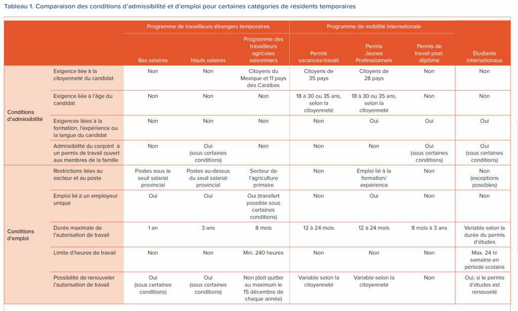 Le tableau 1 présente une synthèse non exhaustive des conditions d’admissibilité à certaines catégories de résidence temporaire ainsi que des conditions associées à l’emploi. Le domaine de l’emploi est utilisé comme illustration de la diversité et de la complexité des règles qui régissent l’admission et le séjour des résidents temporaires. Un exercice comparatif similaire aurait pu être réalisé pour d’autres domaines de droits ou de services, en tenant compte des spécificités de chaque province. Cette comparaison des conditions associées à l’emploi montre que les résidents temporaires sont assujettis à des autorisations et des restrictions très variables pour accéder et intégrer le marché du travail canadien.