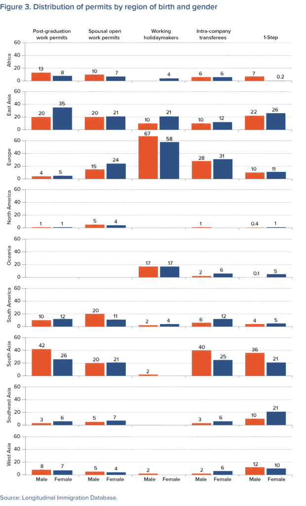 As figure 3 shows, working holidaymakers, particularly men, are drawn overwhelmingly from Europe and Oceania (Australia and New Zealand), reflecting that this stream largely serves citizens of affluent, white-majority countries. By contrast, South Asian and East Asian immigrants dominate the other major pathways such as PGWP, SPOU and ICT for both men and women, although women in the latter category show a slightly higher share from Europe. SPOU permit-holders are the most regionally diverse, spanning every world region.