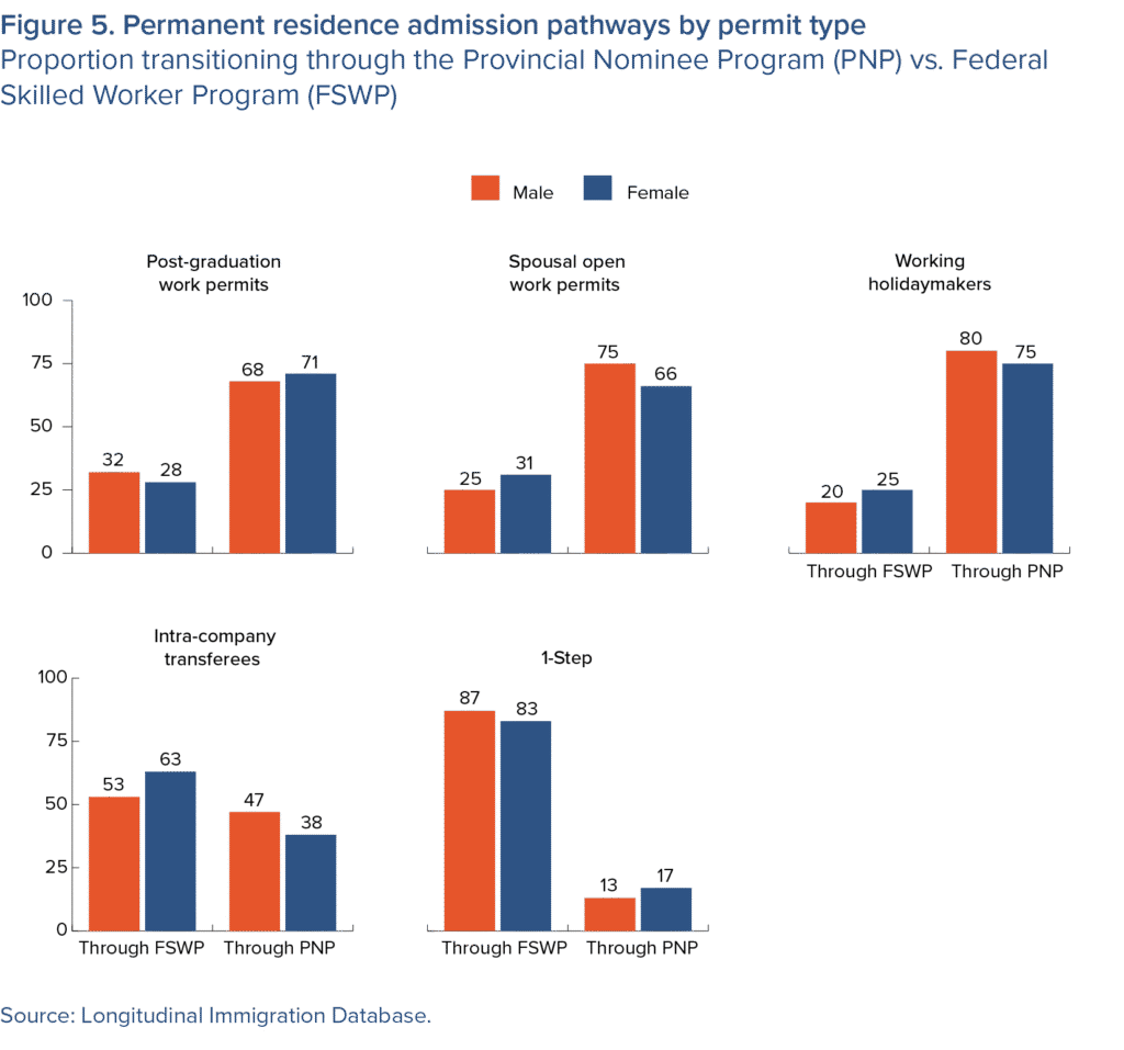 Finally, routes to permanent residence diverge sharply. WHM, SPOU and PGWP permit-holders rely heavily on provincial nomination, whereas ICTs and one-step immigrants most often transition through the federal skilled worker program (figure 5).