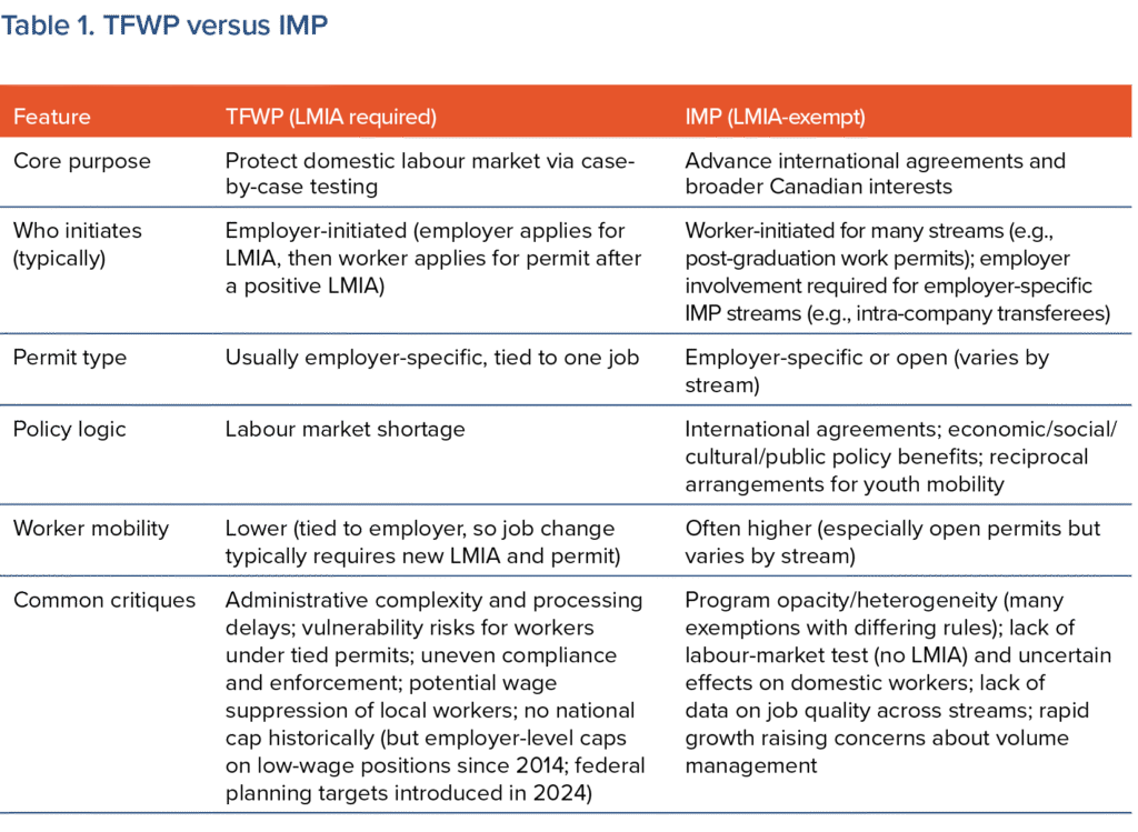 Temporary work permits fall into two broad programs: the Temporary Foreign Worker Program (TFWP), which requires a labour market impact assessment (LMIA), and the International Mobility Program (IMP), which does not.
