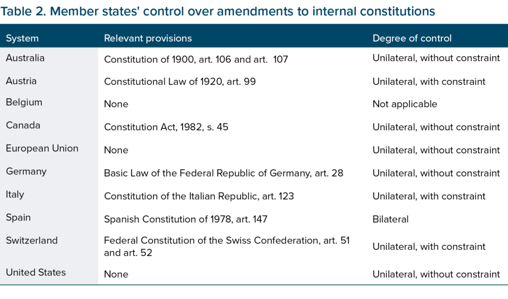 Table 2, based once again on data from our recent publication (Guénette, 2025), shows the degree of control that member states have over amendments to their internal constitutions in 10 different federal systems: